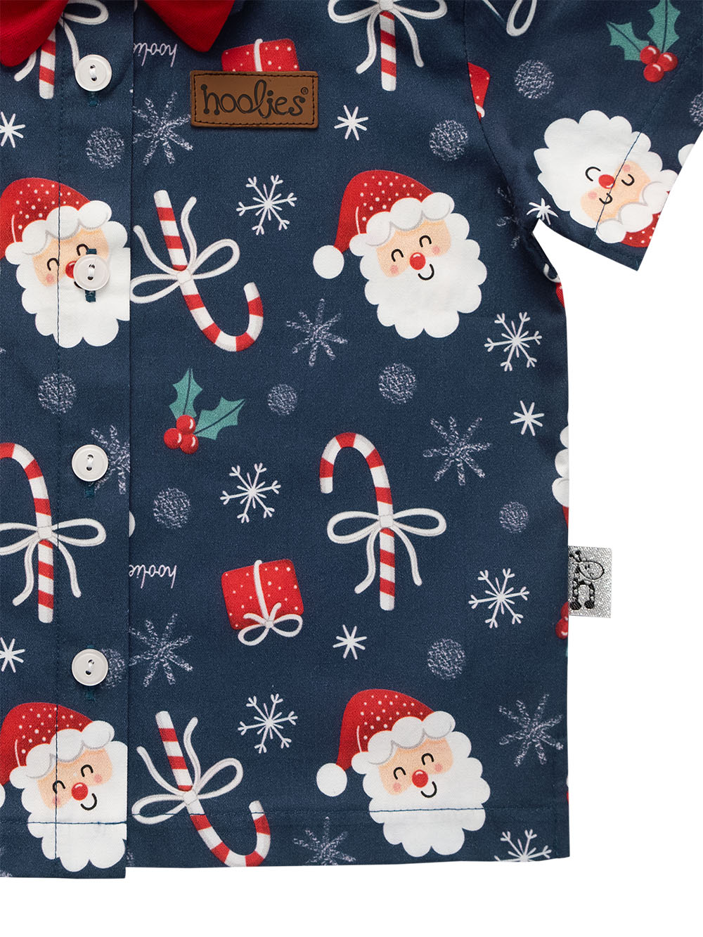 Add some holiday cheer with our woven Boys Christmas Shirt in rich blue, featuring a bright red Santa and candy cane print. Made from soft, breathable cotton, this button-up style pairs perfectly with jeans or shorts for a cool festive look. Match it with little sis in the coordinating romper for the ultimate Christmas outfit combo!