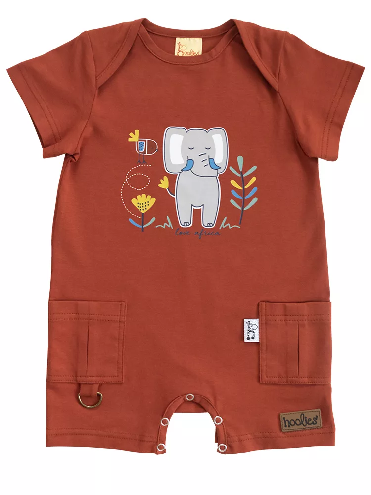 PREMIUM SAFARI Baby Cargo Crawler (resellers only) A cool cotton cargo crawler with an envelope neck for quick changes. The cutest Ellie print for safari play dates.