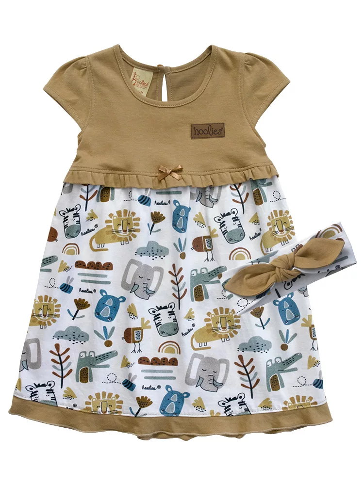 PREMIUM SAFARI Girls Dress (resellers only) Signature Safari print in a cute baby-doll dress with a wide skirt gauge. Edged with a beautiful mustard binding and frills for a pop of colour.