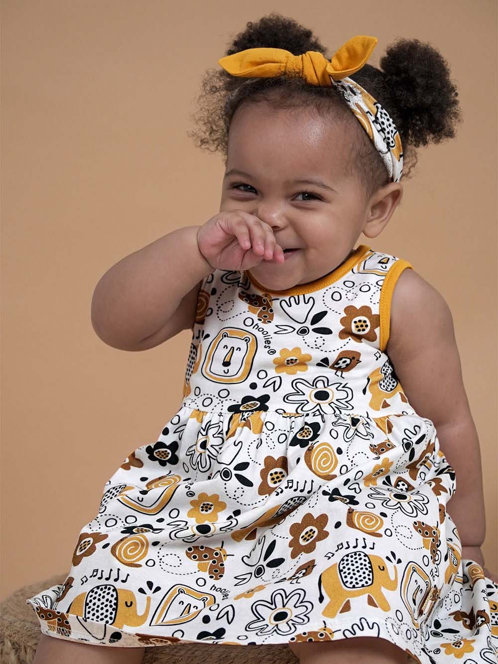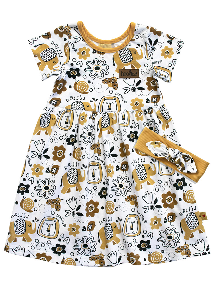 PREMIUM SAFARI Safari Girls Dress (resellers only) Our Ellie Signature Safari prints in a cute baby-doll dress with a wide skirt gauge. Edged with a beautiful mustard binding for a pop of colour. Includes the headband. Our cute Model is wearing a sleeveless sample, kindly note the dress has sleeves.