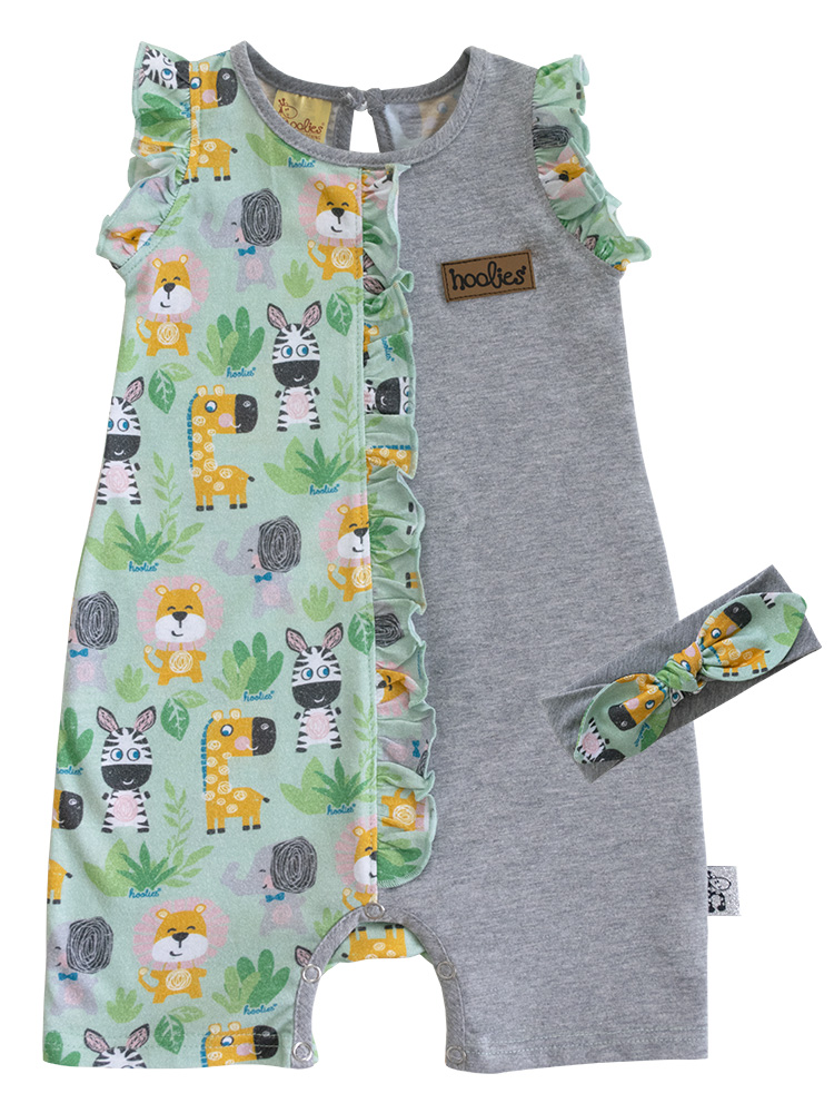 PREMIUM SAFARI Frilly Crawler (Resellers only) The most adorable little frilly crawler in the sweet jungle safari print and matching grey melange knit. The look is completed with a matching headband.