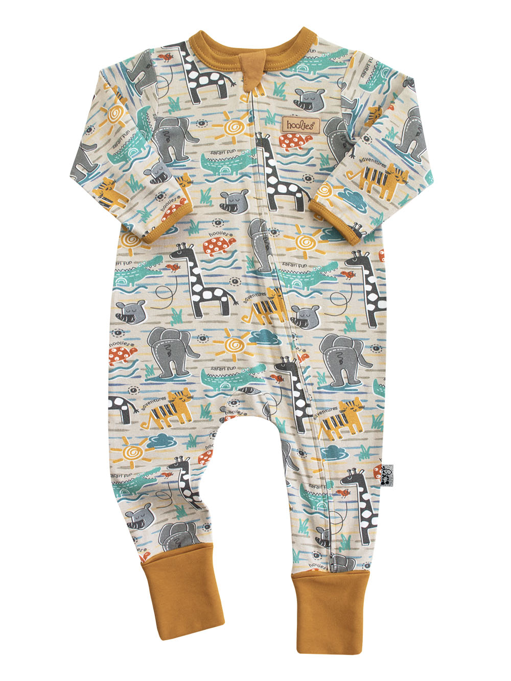 PREMIUM SAFARI BABY Onesie (resellers only) Gender-neutral pure cotton onesie with fold-over footies, rich gold trim and a two-way zip.